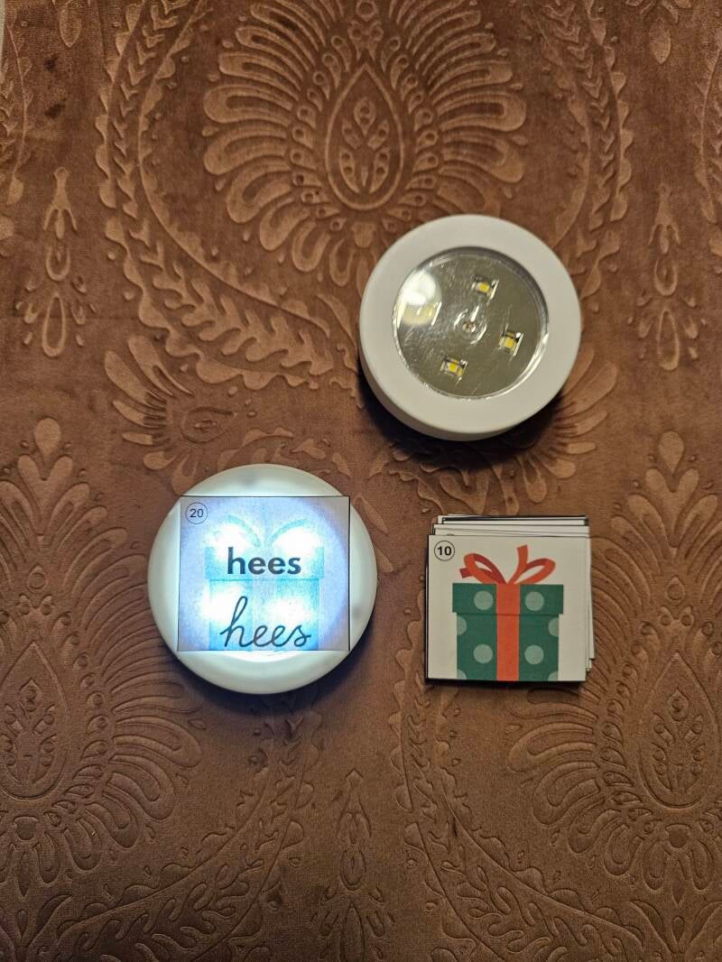 Dit spelletje is zeer eenvoudig te maken. Plak het blad met de pakjes op de woordkaarten en lamineer. Als je dit kaartje nu op een lampje legt, kan je het woord erdoor zien.