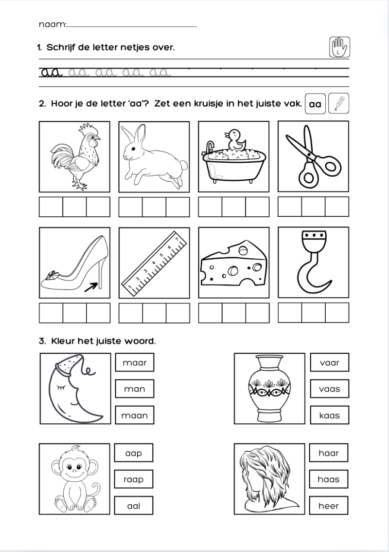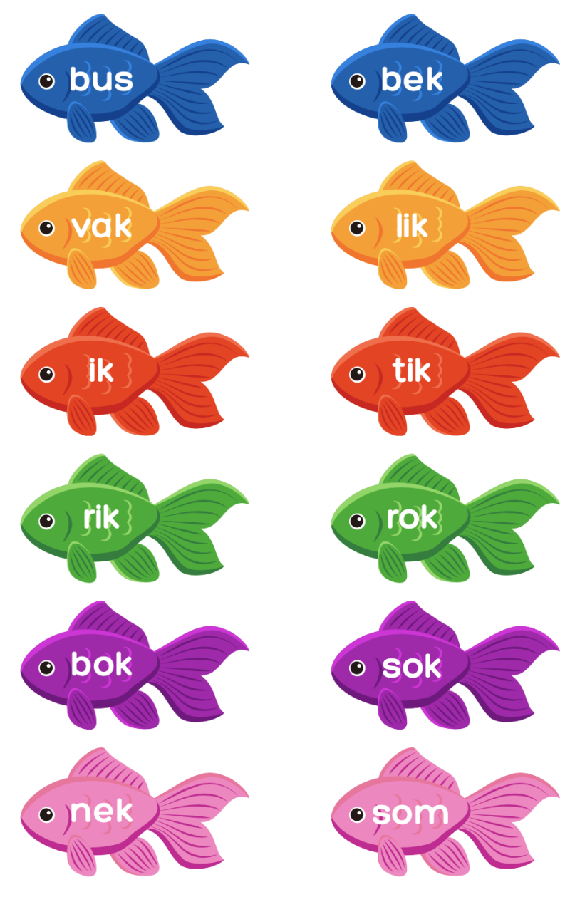 Ze lezen welk woord er op staat. Is het juist? Dan mogen ze de vis in hun eigen aquarium steken. Is het fout, gaat hij terug ik de bokaal.