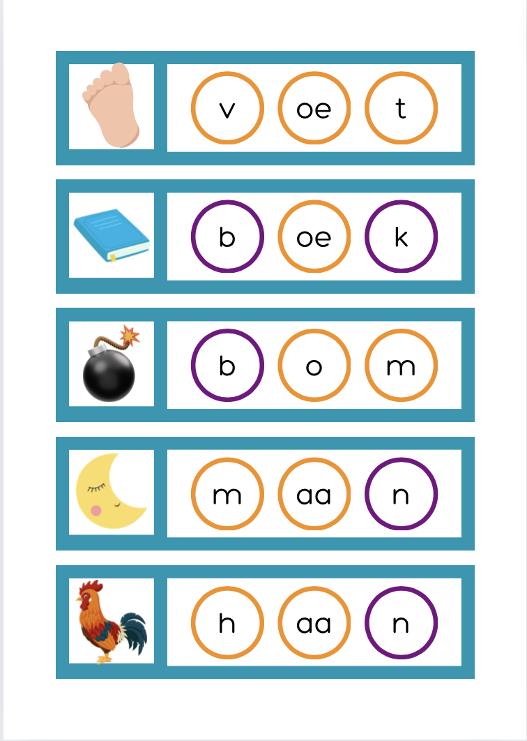 Deze kaartjes gebruiken ze hierbij. 1 kind neemt een kaartje en zegt tegen zijn vriendjes welk woord hij moet springen. Ze controleren elkaar met behulp van het kaartje.